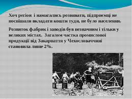 Чеський уряд убачав у Закарпатті тільки аграрно-сировинну базу своєї держави. Вага промисловості в економіці краю не перевищувала 2%. Чеська влада намагалася підтримати аграрний сектор Закарпаття, передаючи селянам окремі землі угорських поміщиків. Та сільському господарству катастрофічно бракувало капіталовкладень.